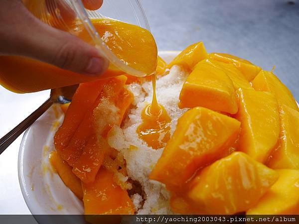 這不是假的化學芒果醬,而是店家處理芒果時的新鮮打的芒果醬,可以自由添加
