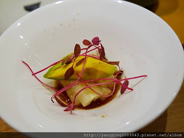 前菜是紅莧菜佐酪梨撒上烏魚子粉及比目魚佐柚子胡椒