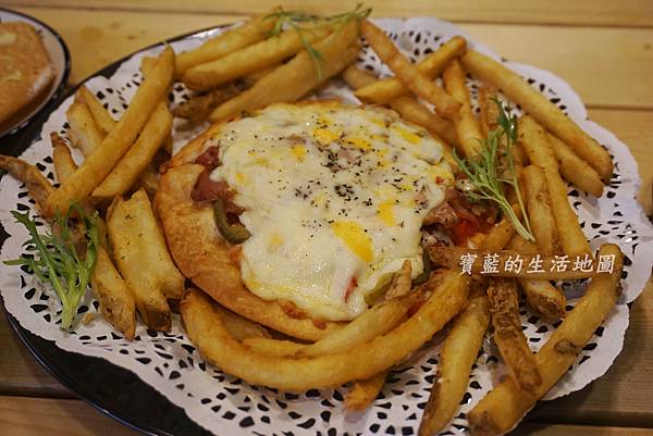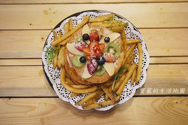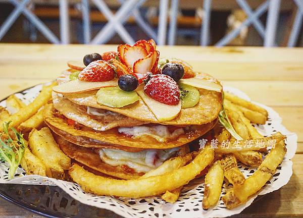 總共有四層披薩,鹹甜各兩層,旁邊附上的是薯條
