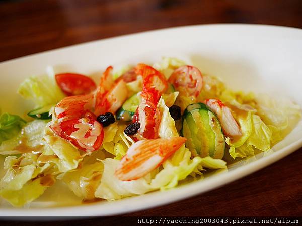 沙拉有生菜、番茄、小黃瓜、蟹肉條等