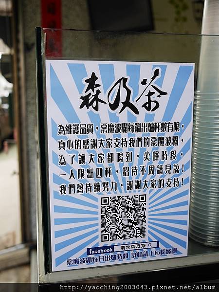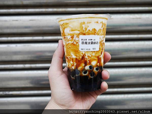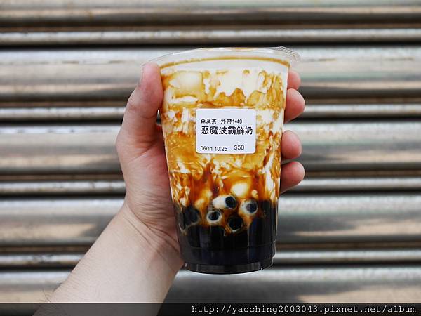 台中清水 森及茶,IG及網路快速爆紅的人氣惡魔波霸鮮奶,一人限購4杯,每日出爐時間請關注店家FB,高大鮮奶淋在煮沸的黑糖珍珠上所染出的色澤已讓該店成為清水超人氣商店,高美路前段