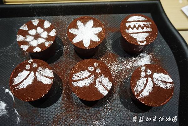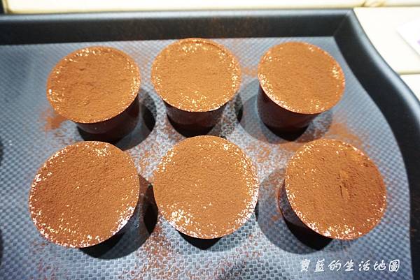 灑上滿滿地防潮可可粉,直到看不到蛋糕麵糊顏色哦~