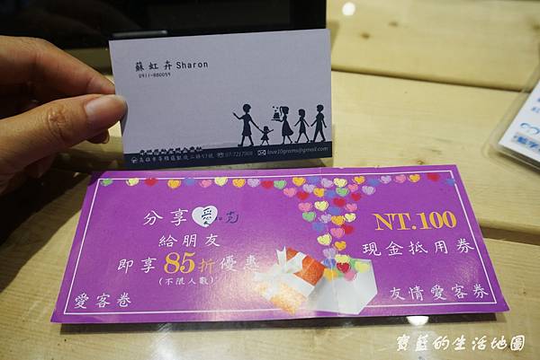 感謝今天Sharon的耐心陪伴和教導,還送給我們分享券和折價券給新朋友