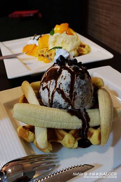 比利時鬆餅是偏有口感的,外面比較硬,所以店家提供刀叉讓客人方便食用