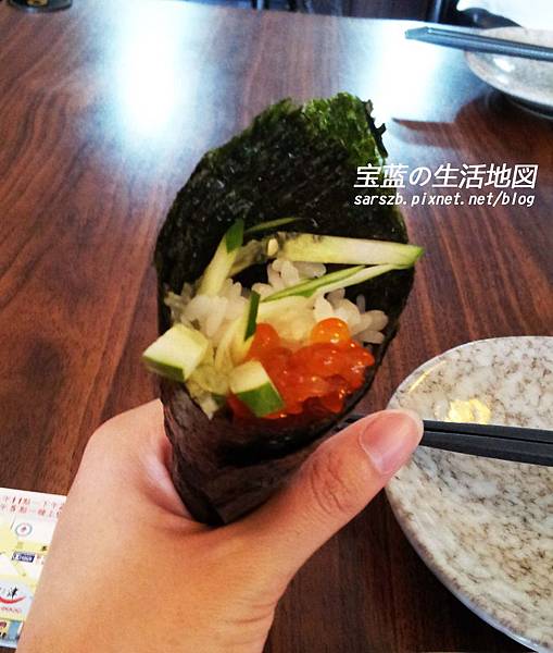 酥脆的海苔包著米飯再舖上一些鮭魚卵,裡面再包著一些沙拉