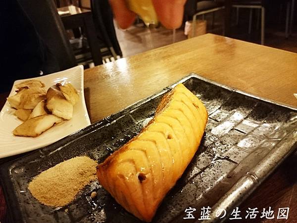 鹽烤鮭魚淋上一點點檸檬汁液,這鮭魚很新鮮厚實