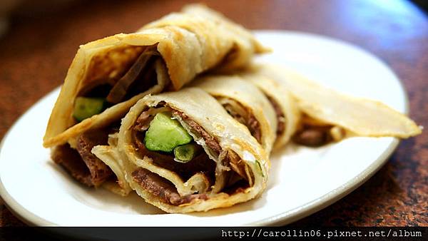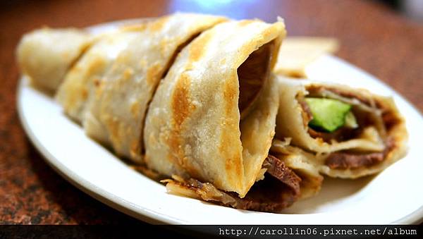 大餅捲牛肉,模樣滿豪邁的,吃起來我個人覺得還不錯,不過如果不是像我這樣討厭吃蔥,可能就會覺得裡頭蔥用量太吝嗇了吧?