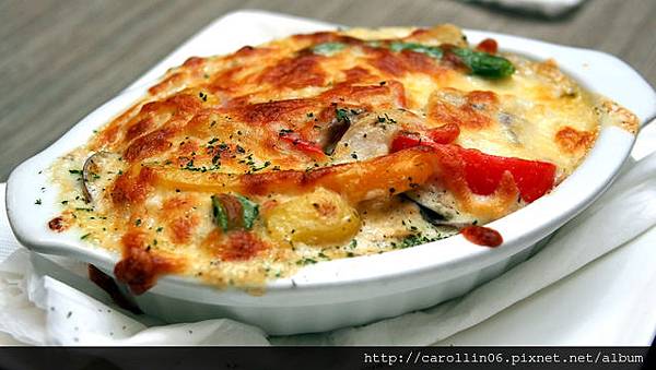 奶油海鮮白酒醬汁焗飯的模樣看起來也很不錯,不過上頭出現了我也很不喜歡的食材:甜椒!