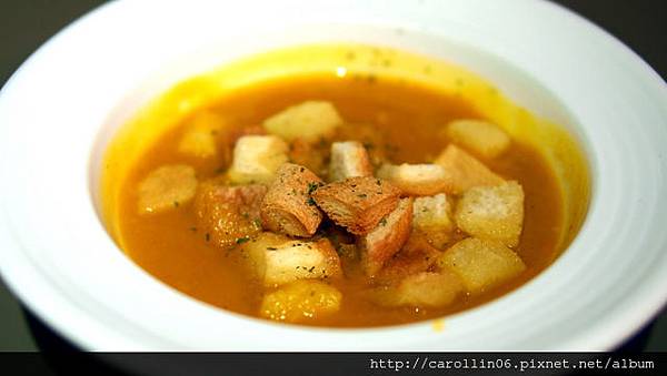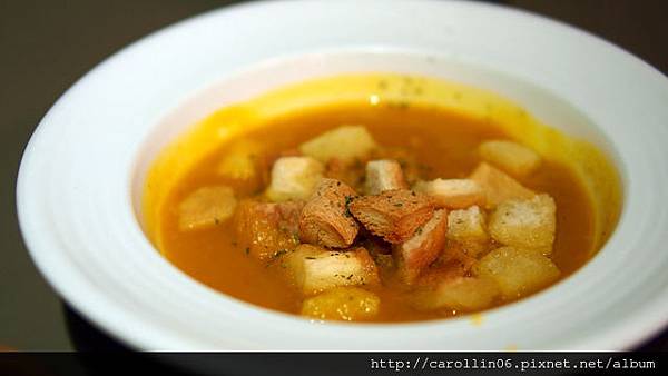 他的套餐南瓜濃湯倒是嚇到我了,一開始看見上頭的麵包丁有些興奮,仔細一看卻發現量有點過度,尤其吸飽了湯汁...