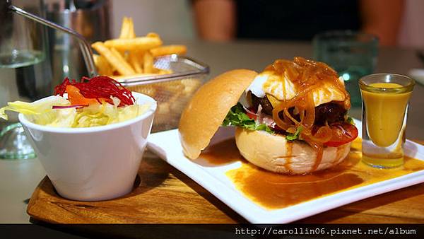 這漢堡味道不差,只是蛋黃讓人吃前頭疼,破壞了又心疼。最大的問題還是在麵包,使用的麵包並不差,但送來時底下就已經滿是醬料,被湯汁灌溉後的麵包又重蹈了濃湯的覆轍...(汗
