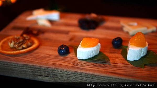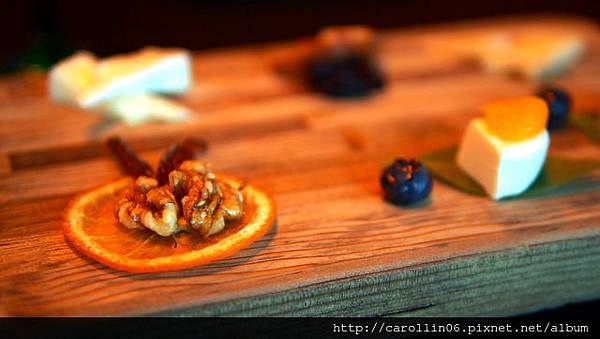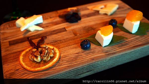 上頭的東西都是可以配著一起吃下去的,第一個的柳橙干就讓我們很傻眼,因為沒有切過,所以只能兩個人看誰要吃了,吃起來沒什麼調味,核桃就香香的。右邊的這個很明顯就一人一組,不過我不吃藍莓和羅勒葉,只配著上面那小個水果吃倒也OK。
