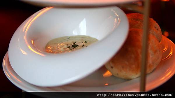 從下往上吃起,下層有4顆義式香料麵包,及一小碟奶油蟹肉沾醬。