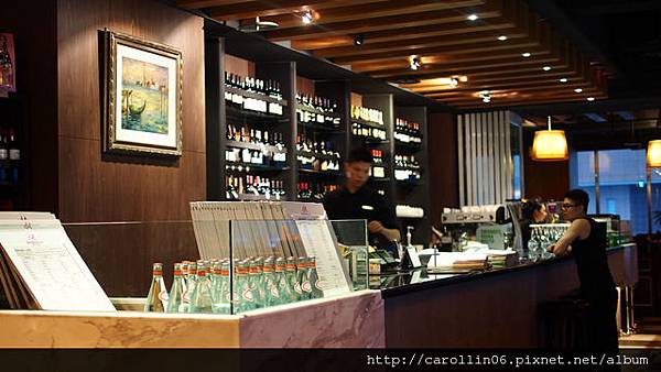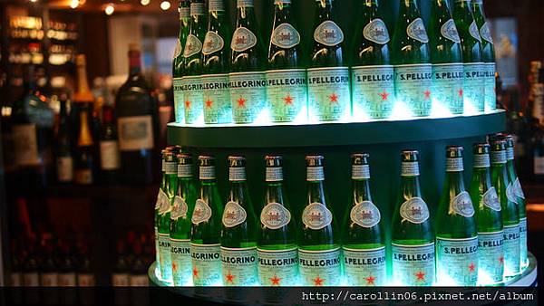 一進門便可看到這義大利氣泡水瓶排成聖誕樹般的模樣。