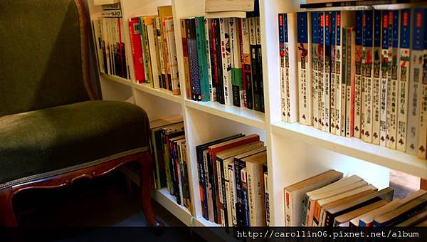 書櫃裡的書也很不少,比起以各種八卦、時裝雜誌為主的咖啡店書櫃,這個書櫃裡的書反而讓我更為欣賞,有不少好書啊!!村上春樹的書還真不少,除了滿滿的村上春樹之外,還有許多很經典的書集呢~