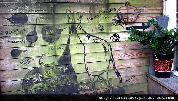 木板上的塗鴉有些詭異,但又覺得好可愛呀!