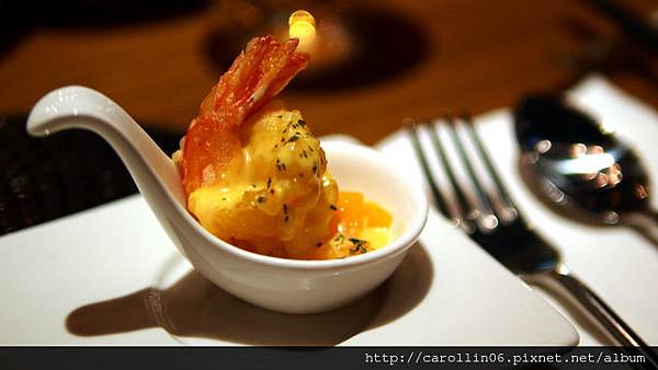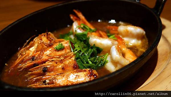 主餐之一的泰式三味胭脂蝦,比起大蝦,這使用了個頭較小、蝦膏卻更濃郁的胭脂蝦讓男友吃蝦頭吃得很開心,且烹調的連殼吃也都可以了!