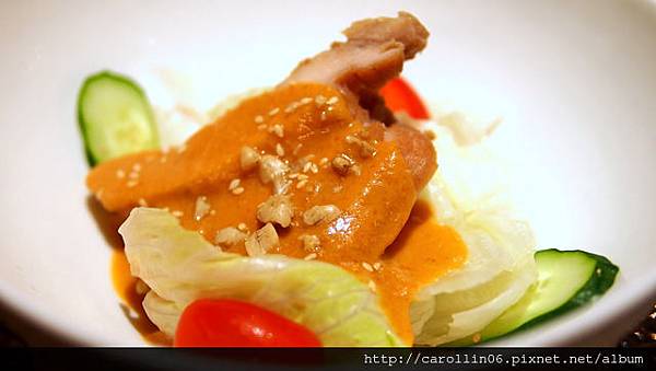 沙拉我選的是雞肉沙拉,這醬味道也很特別,稍微有點辣,而融合花生的味道讓試味道的男友很喜歡。這款沙拉醬也讓不喜沙拉的我很能接受,尤其使用份量剛好能再所有的菜均勻沾附,反而雞肉不夠嫩這點稍為失色了些。