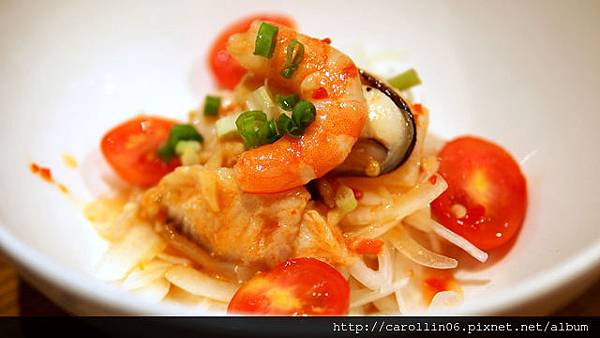 海鮮沙拉視覺上很討喜,味道說也很不錯,不過喜愛花生的男友比較喜歡我的沙拉醬。