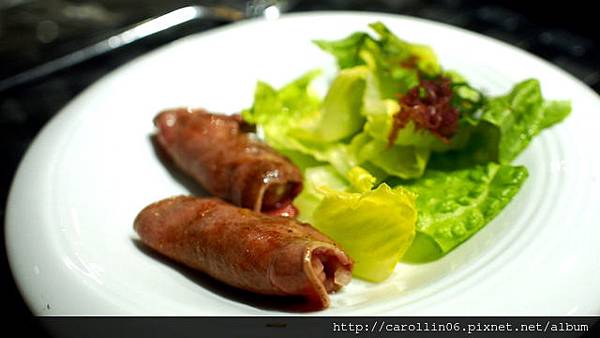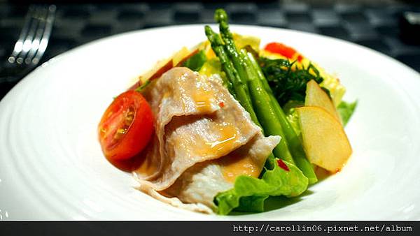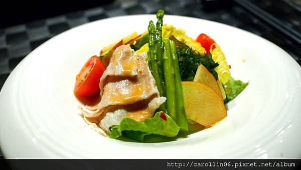 第一道的沙拉,可選擇松板豬或牛舌,不敢吃牛舌得我自然選擇了平常不會為我所選的松阪豬...因為切得非常薄,這肉吃起來沒什麼特別口感,而胡麻醬味道雖香卻太淡了,用量又很少,不太夠生菜們均勻沾用。
