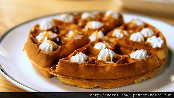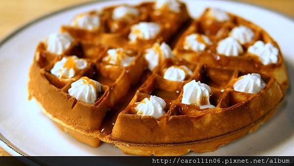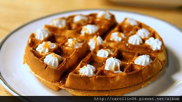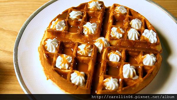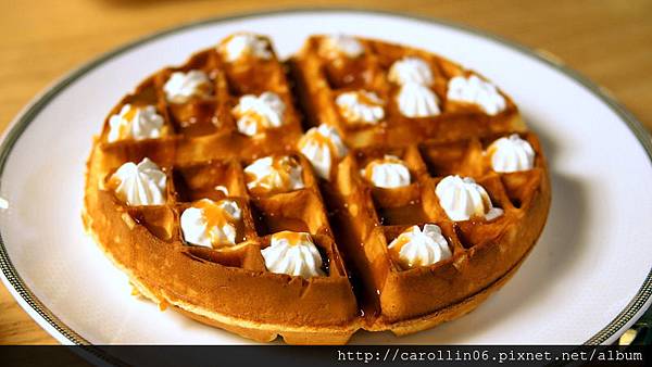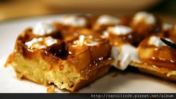 直接將大量的焦糖和鮮奶油置入鬆餅方格內,不需要再自己慢慢一口一口沾著吃,除了很怕切下去焦糖外漏,這樣吃還挺方便的!