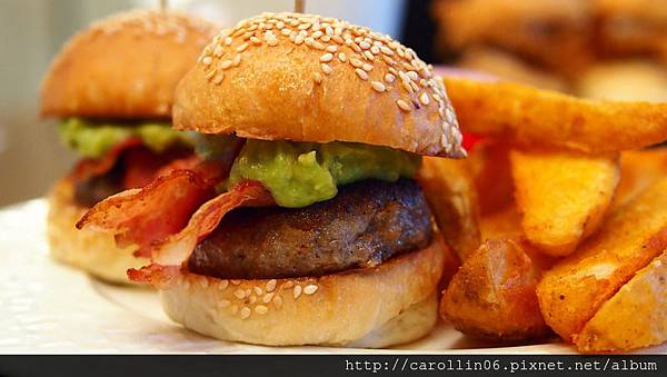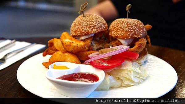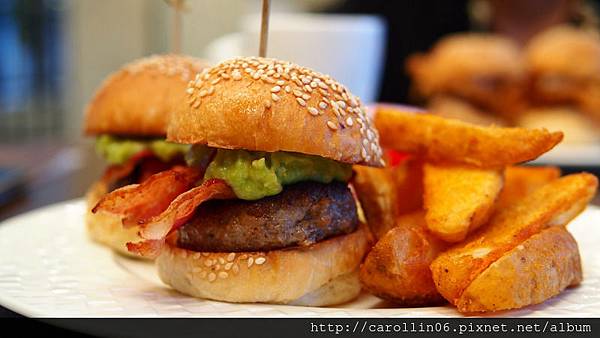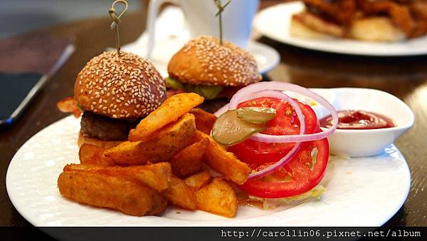 這次我們兩個餐點都是點迷你漢堡,整體擺盤就這個樣子,除了兩個同口味的迷你漢堡以外,還有好吃的薯條及我不吃的生菜,而沾醬在一旁讓人自行決定要怎麼個吃法。