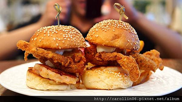 兩個迷你漢堡中的軟殼蟹剛好是一整隻,這樣擺法看起來好像有點獵奇...