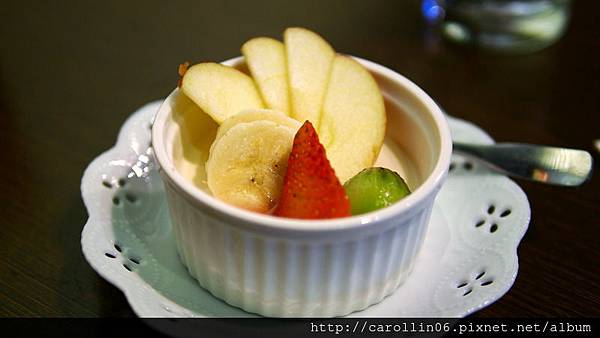 甜點水果奶酪,上頭的新鮮水果很新鮮,剛送來的時候蘋果片顏色整個還未氧化~