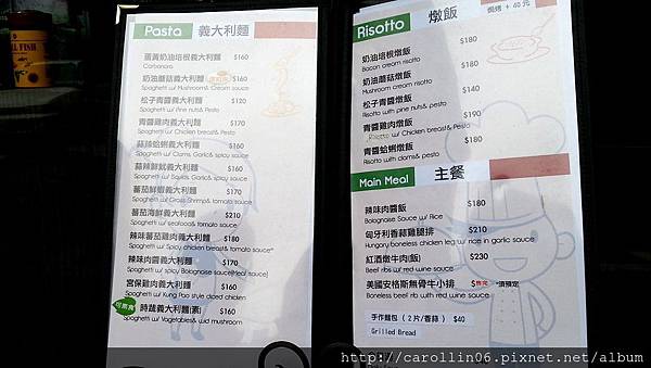 最後貼一張菜單照片,意思意思表示一下大概價位,以台北這一帶餐廳來說,同時也以台北的義大利麵等餐點來說,這價位確實算平實。整體上味道、價位都不錯,加上可以久坐聊天,店內有許多特色裝飾,讓我們對這間店的評價都還不錯。