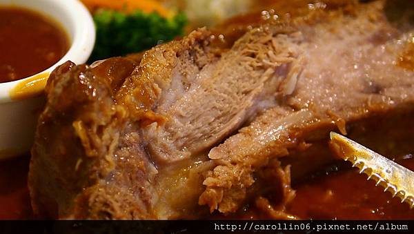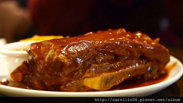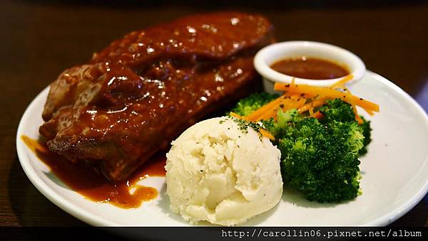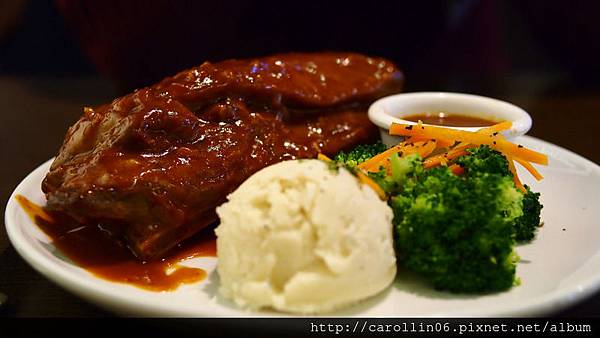 接著是美式BBQ爐烤豬肋排,一送上桌這模樣真是嚇了我一跳,長得跟台塑牛排還真相像!不過這邊可沒有服務到幫忙切肉去骨的程度XDDDD