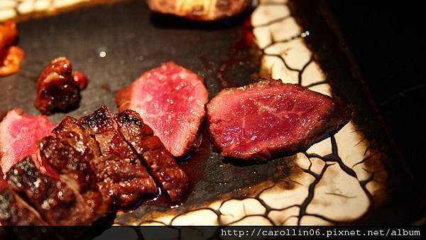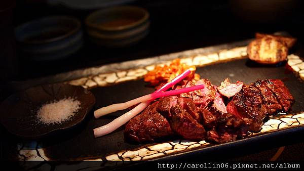 最後我的香煎牛小排重點終於來了,牛肉很好吃,簡簡單單不需要太多調味,可以自行使用旁邊的海鹽。不過中間部分和兩邊的熟度差很多,我負責吃中間如下圖那樣兩三分熟的部分,其他五分~七、八分對我來說有點太熟剛好其他人敢吃,好一個分工合作!!
