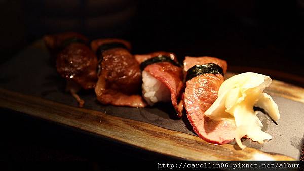 等到湯上完應該結束的時候,突然牛小排套餐的牛肉壽司出現了,順序真的很弔詭。