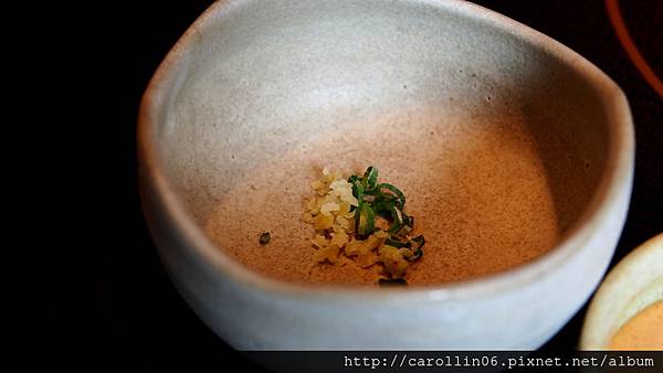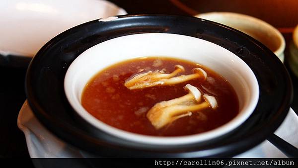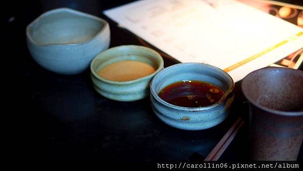 桌上一開始就放了好幾個東西,左邊數來是茶杯、醬x2、以及湯碗,湯碗裡面有放蔥