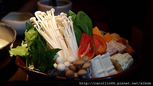 野菜缽送上桌時,服務人員會替客人陸續將菜放進鍋子裡煮,但我其實很想叫他停手換我們自己來,筷子根本就不大會拿還做這個工作,過程中還掉東西到桌面上......