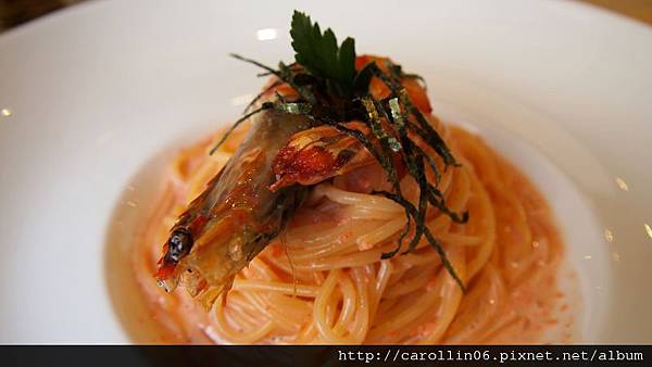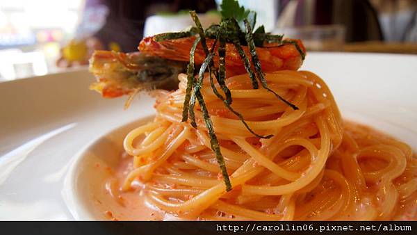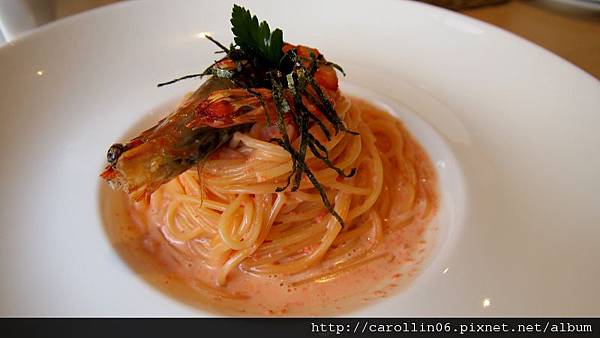 我點的鮮蝦明太子義大利麵,吃起來我覺得比Dazzling我滿喜歡的明太子義大利麵好些,因為這邊的醬料還帶有一點點微辣,所以比較不似Dazzling的容易吃到後面覺得膩。