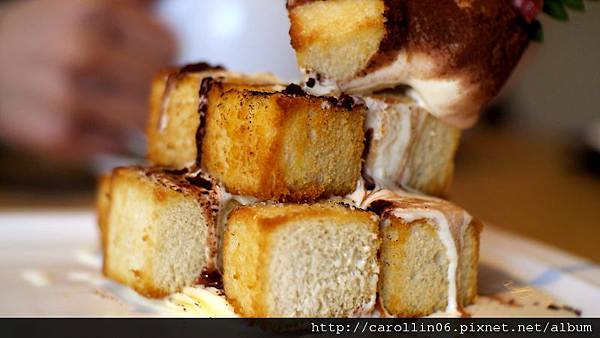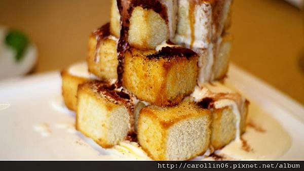 跳舞香水最出名的就是這一到甜點,招牌法式金磚蜜糖吐司,跟一般常見的那種樣式真的很不一樣,直接省略了那個麵包皮,所以形狀就跳出了原有的框框。