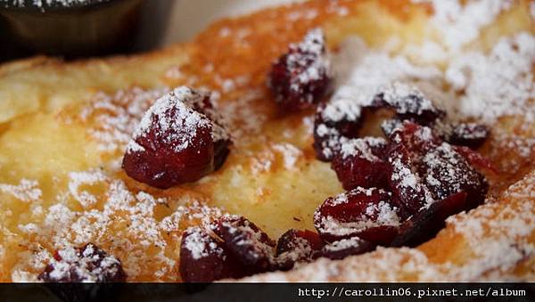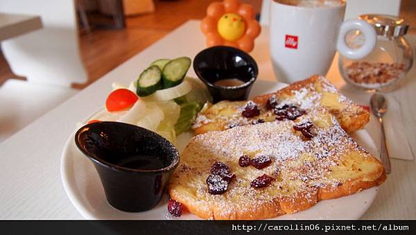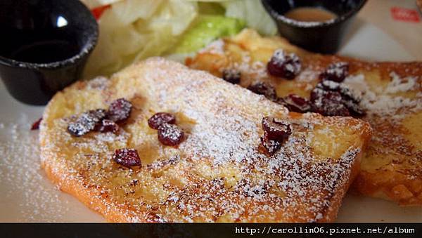 法國吐司,這是一種將牛奶和蛋汁混合而成的汁液,包覆住鬆軟的土司,然後在下鍋煎,可以將整個蛋奶的精華香味都鎖在裡面,而口感會很紮實比單純吐司還要鬆軟。比較特別的是,這個還有灑上細細的雪白糖粉和蔓越莓乾,視覺上又顯得更可愛了,吃起來也很香甜,若不夠甜左邊還有放蜂蜜可以沾。