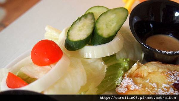 旁邊則放了沙拉搭配,那菜看起來就品質很好很新鮮,基本上我會怕生菜,但這我看了也覺得好像還不錯。而沙拉的醬,是很香的胡麻醬,因為有很濃的芝麻香味,所以要不是還有一些醋的味道,還真覺得有麻醬的感覺。很香,只沾一點點就蓋的過去生菜本生的草味,所以我很難得的把沙拉吃完了。