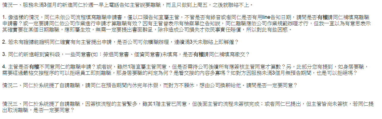 說穿了其實預告期間是在保護勞工的,因為就實務上來說,員工屬於經濟之弱勢,所以他們得隨時終止合約走人,如果是三個月以內,基本上根本沒有預告期間的問題,因此除非員工的自行離職有造成公司實質上的損害,而公司以民法加以求償,除此之外,勞基法其實並沒有強制勞工一定要遵守預告期間。