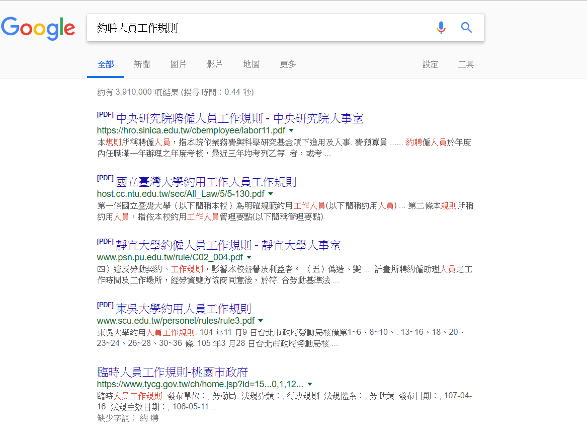 再來就是學校公佈『約聘人員的工作規則』,我為了避免有誤差,我剛還Google查了一下,以下是查詢的結果: