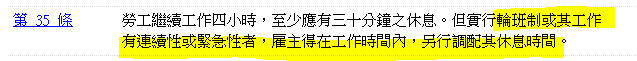 勞工工作四個小時得休息30分鐘,但我們看一下後面黃色註色的部份,其實某種程度來說,將休息時間分開休息其實不一定是違法的,至少從字面上來看,是依法有據的。